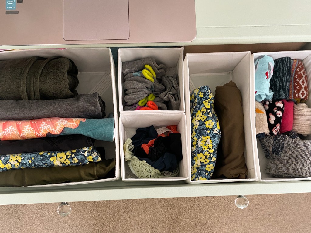 My closet and drawers don’t really look any different then they did before in terms of volume, but the were two empty plastic bins and an empty cardboard box as a result. Literally all of my clothes, bags, and shoes are in my closet and drawers! And my winter coat is downstairs on it’s coat hook by the door, I also didn’t even bring up my snow boots and everyday boots, even though I technically *should* have, but they don’t spark joy but I literally have to have snow boots. I live in the Ottawa area, like I actually have to have winter boots. But here are the empty bins for celebration!