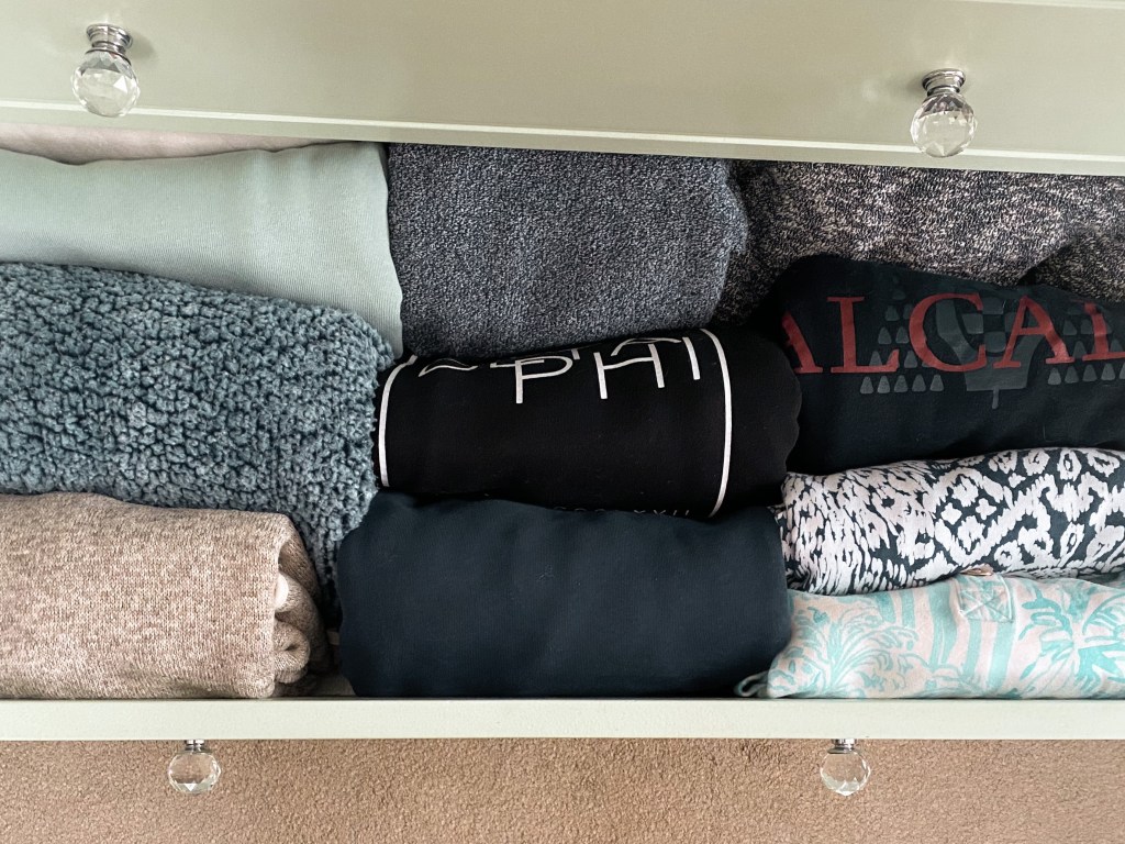So Marie says not to organize anything until you have fully finished decluttering everything, but there is no way I have that kind of space and I definitely could not live with mounds of stuff around my room. She also recommends folding as much as possible, basically everything that isn’t super soft and flowy or super structured; but that is also not for me. And this is what it looks like now!