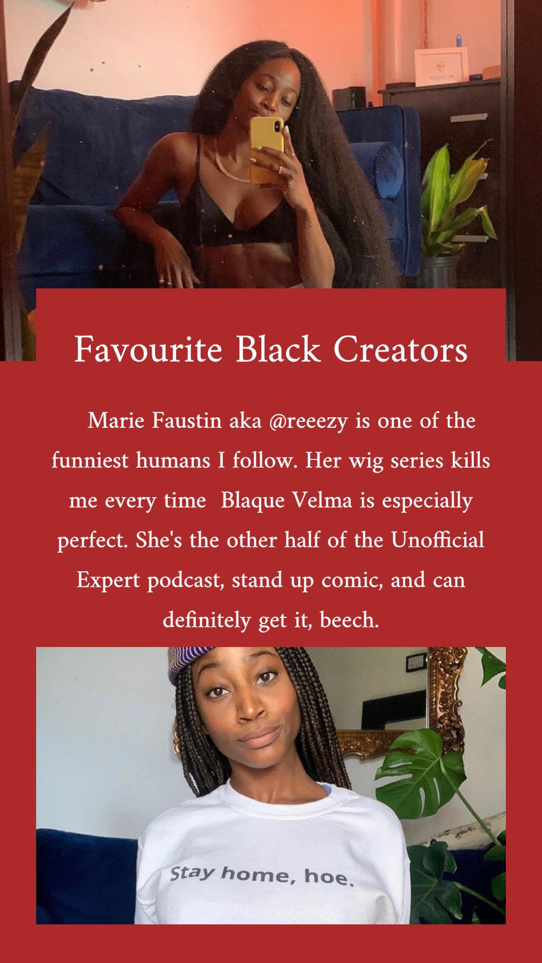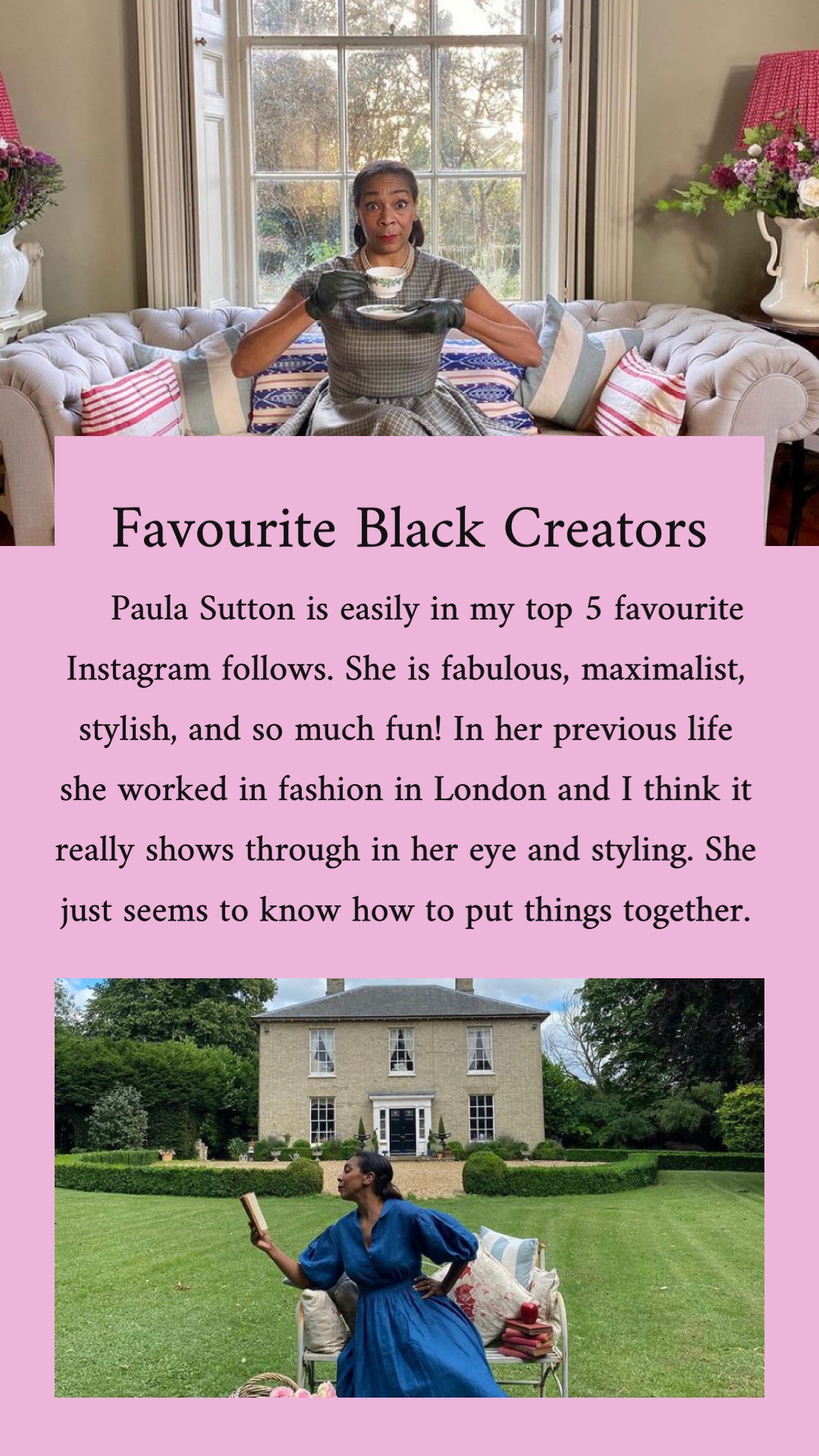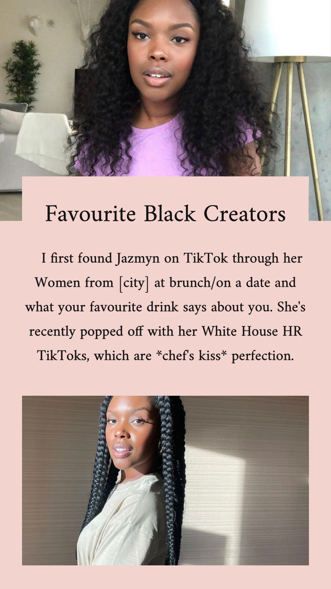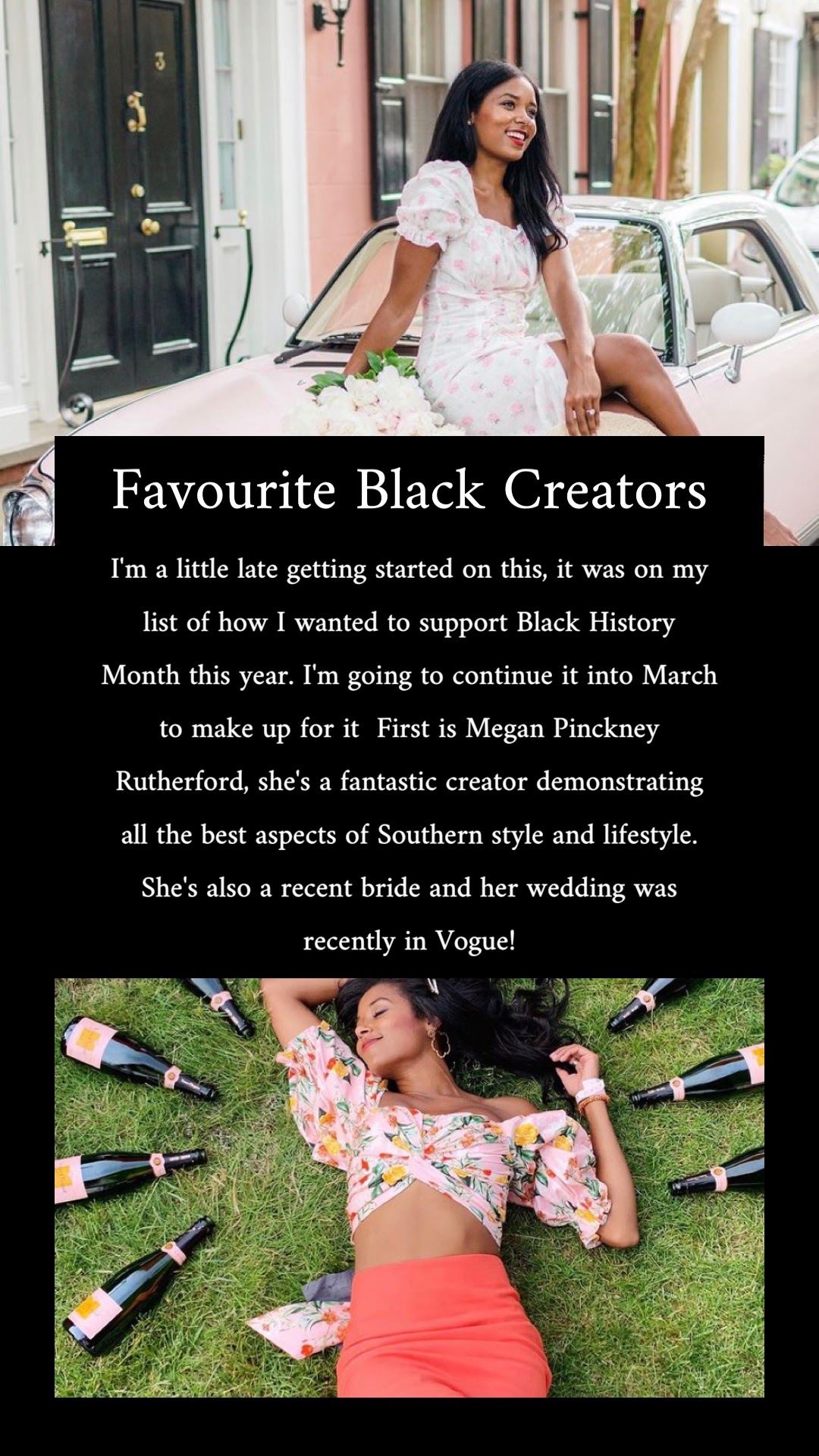 Over on my Instagram in February 2021 I did a daily story feature of a different favourite Black creator. Sometimes it was influencers, others artists, poets, and dancers; they were almost always female. But I was choosing the people that I truly admire their content or their work and those people happened to be women. I wanted to provide a space outside of story highlights to memorialize these creators and thank them for their work!