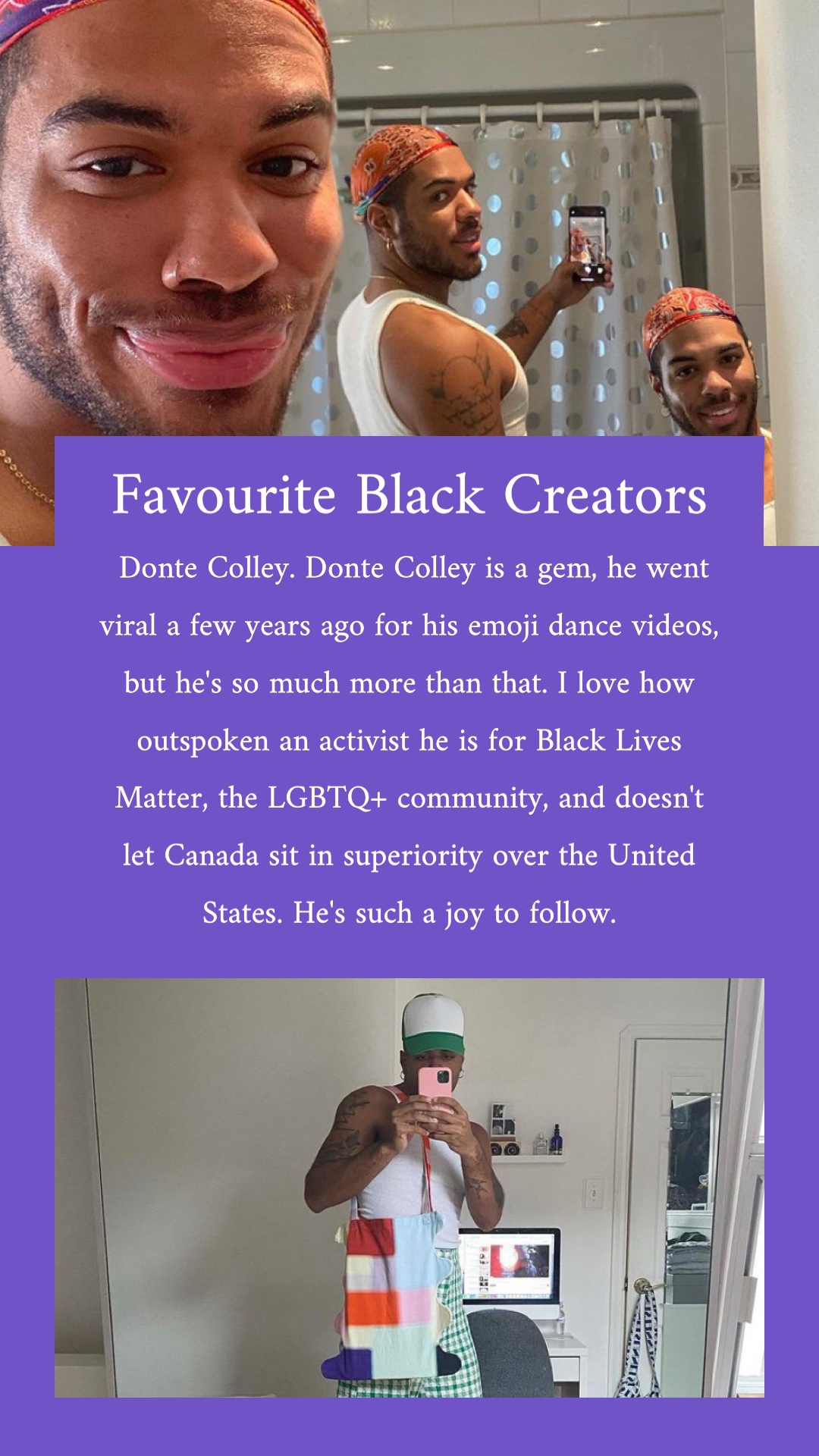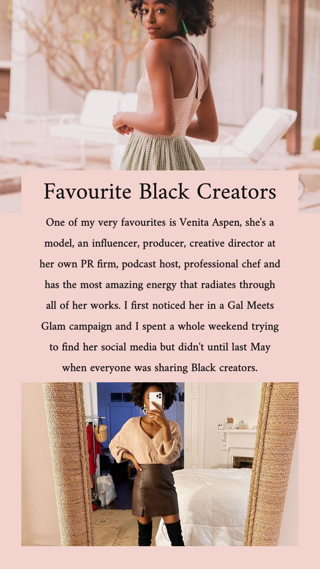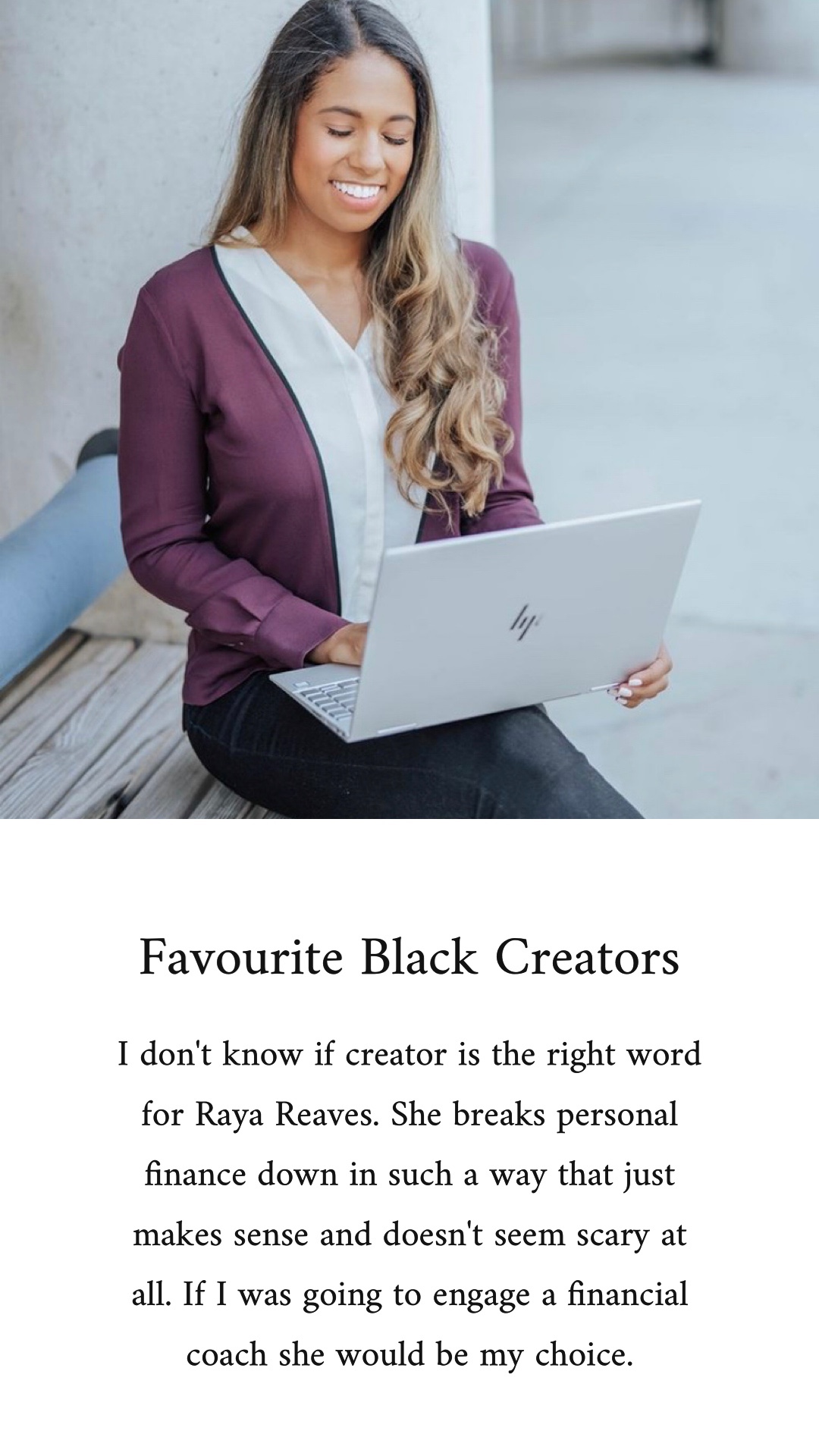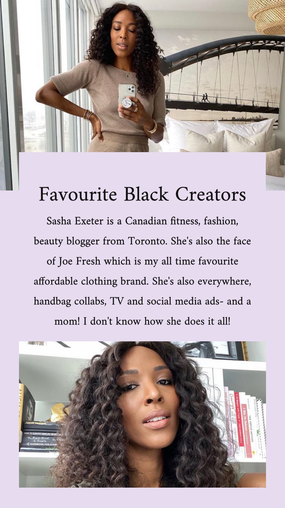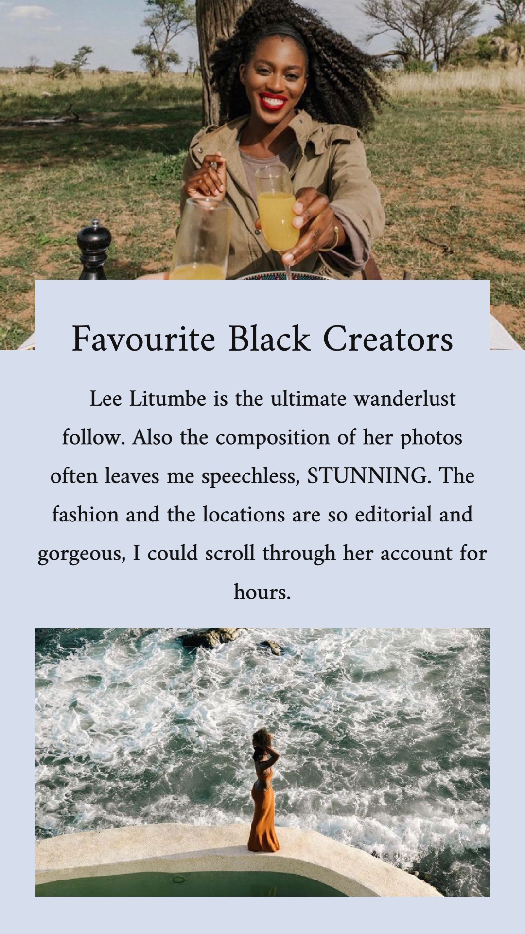 Over on my Instagram in February 2021 I did a daily story feature of a different favourite Black creator. Sometimes it was influencers, others artists, poets, and dancers; they were almost always female. But I was choosing the people that I truly admire their content or their work and those people happened to be women. I wanted to provide a space outside of story highlights to memorialize these creators and thank them for their work!