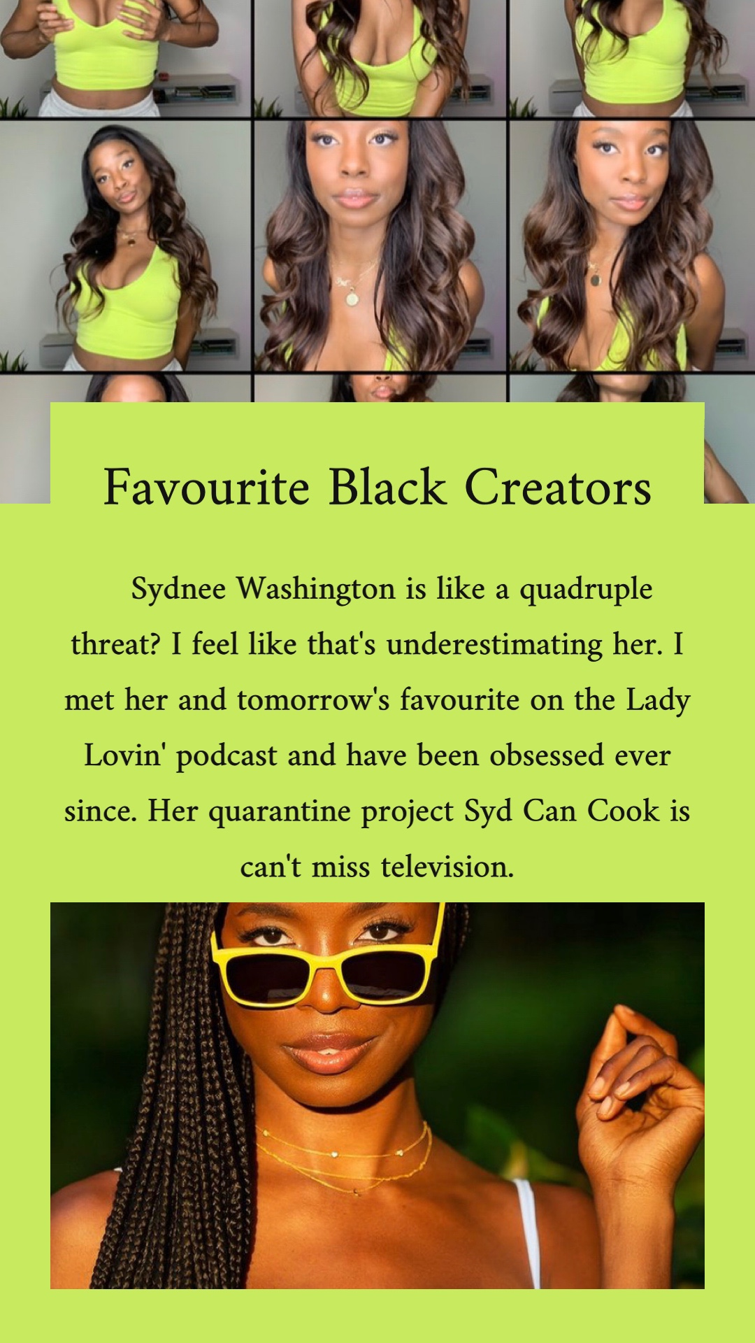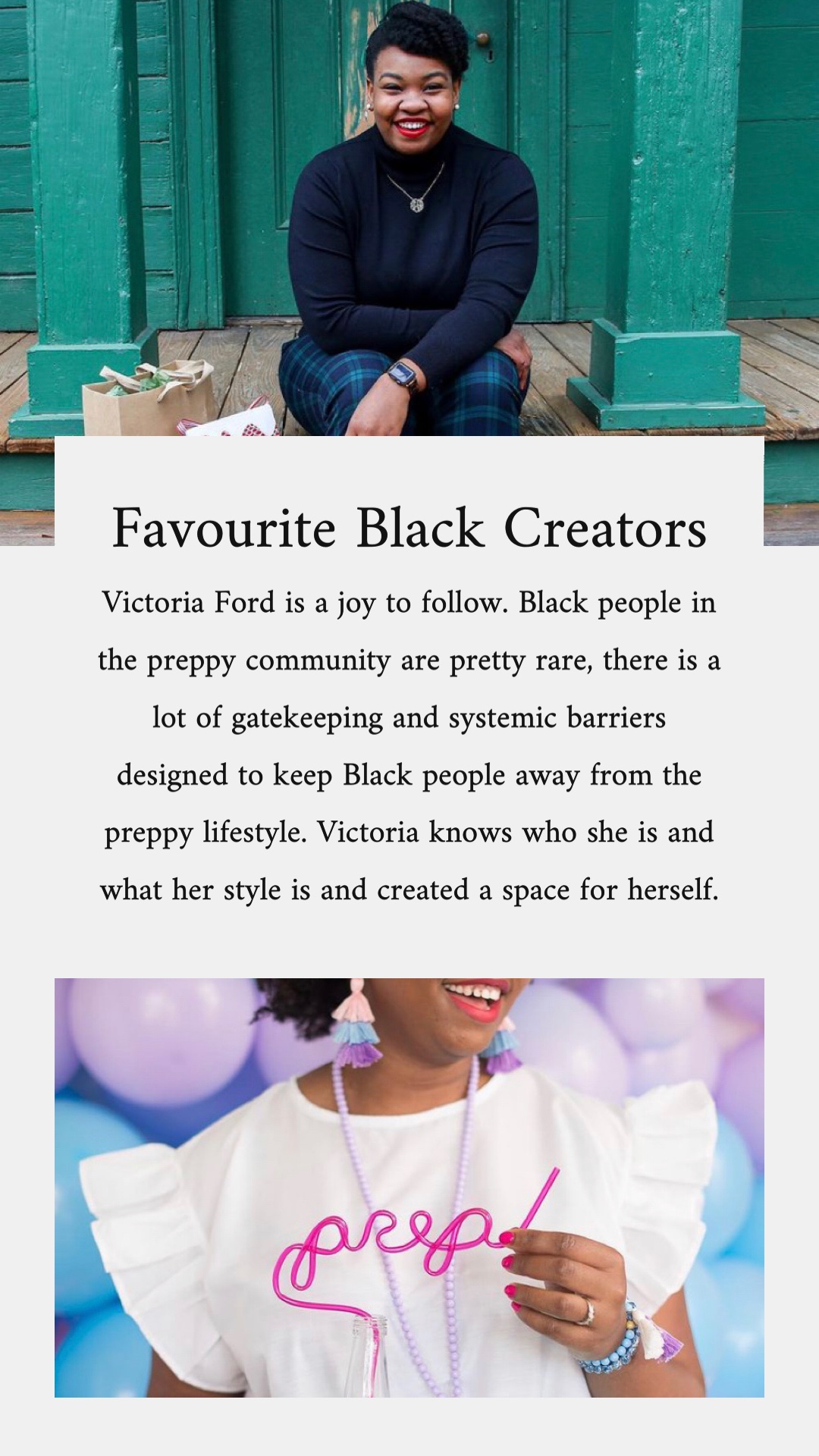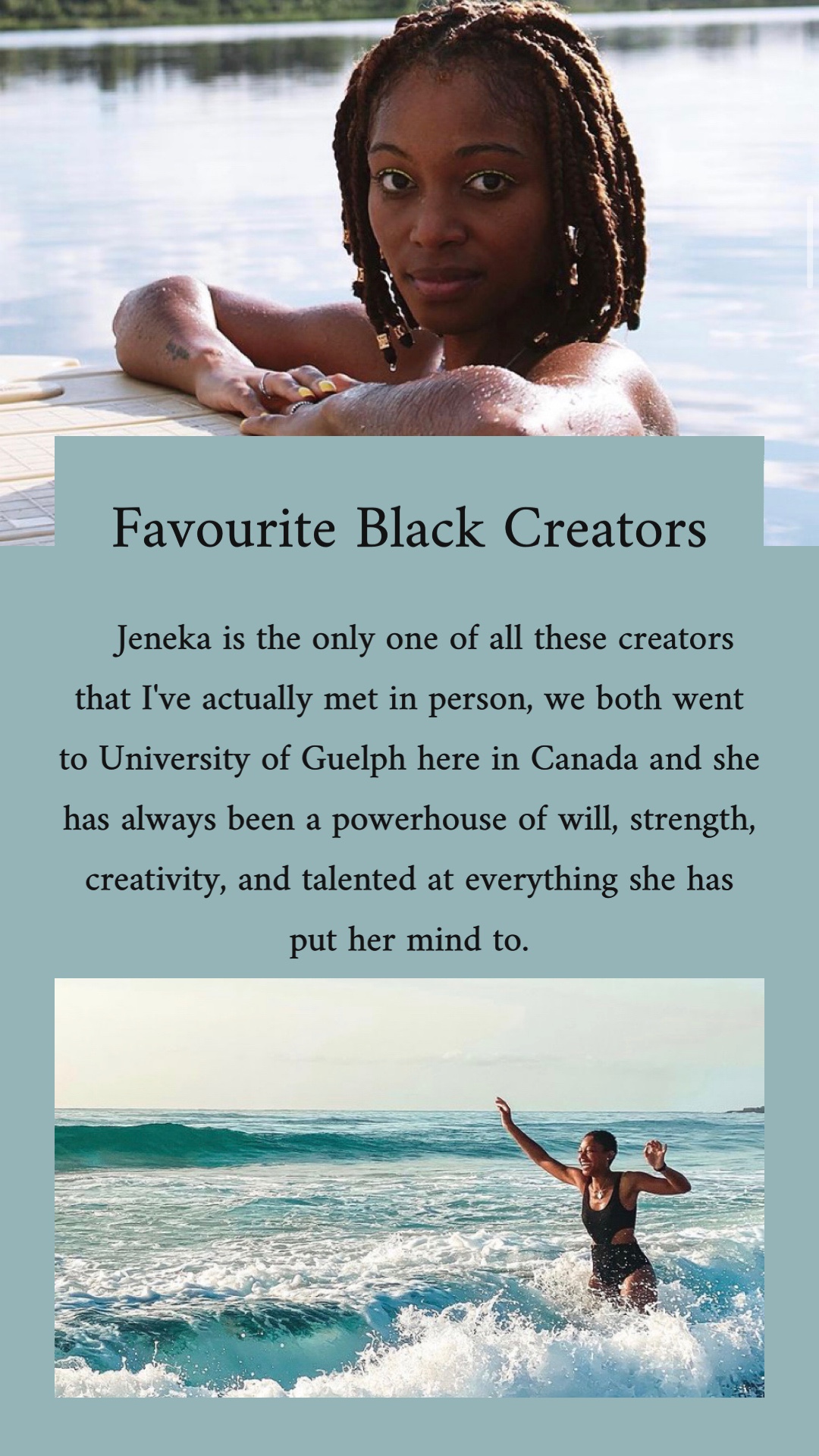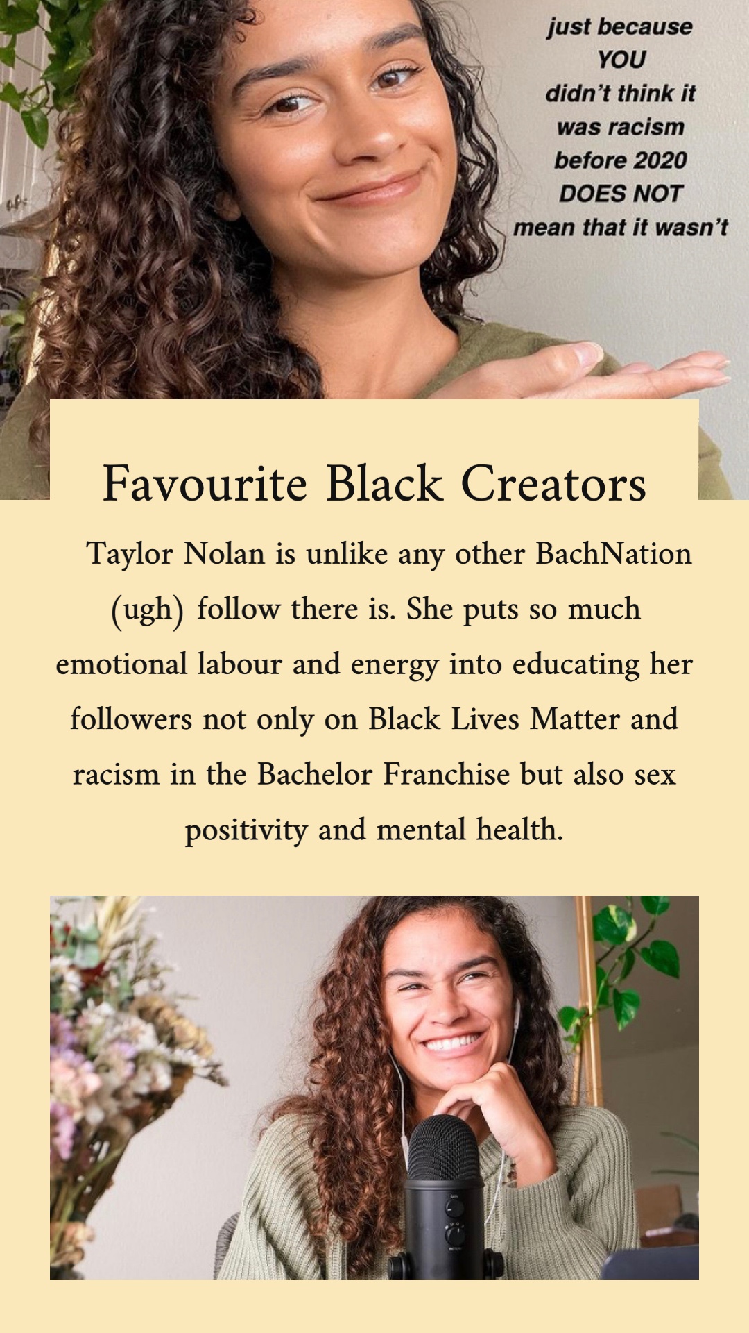 Over on my Instagram in February 2021 I did a daily story feature of a different favourite Black creator. Sometimes it was influencers, others artists, poets, and dancers; they were almost always female. But I was choosing the people that I truly admire their content or their work and those people happened to be women. I wanted to provide a space outside of story highlights to memorialize these creators and thank them for their work!