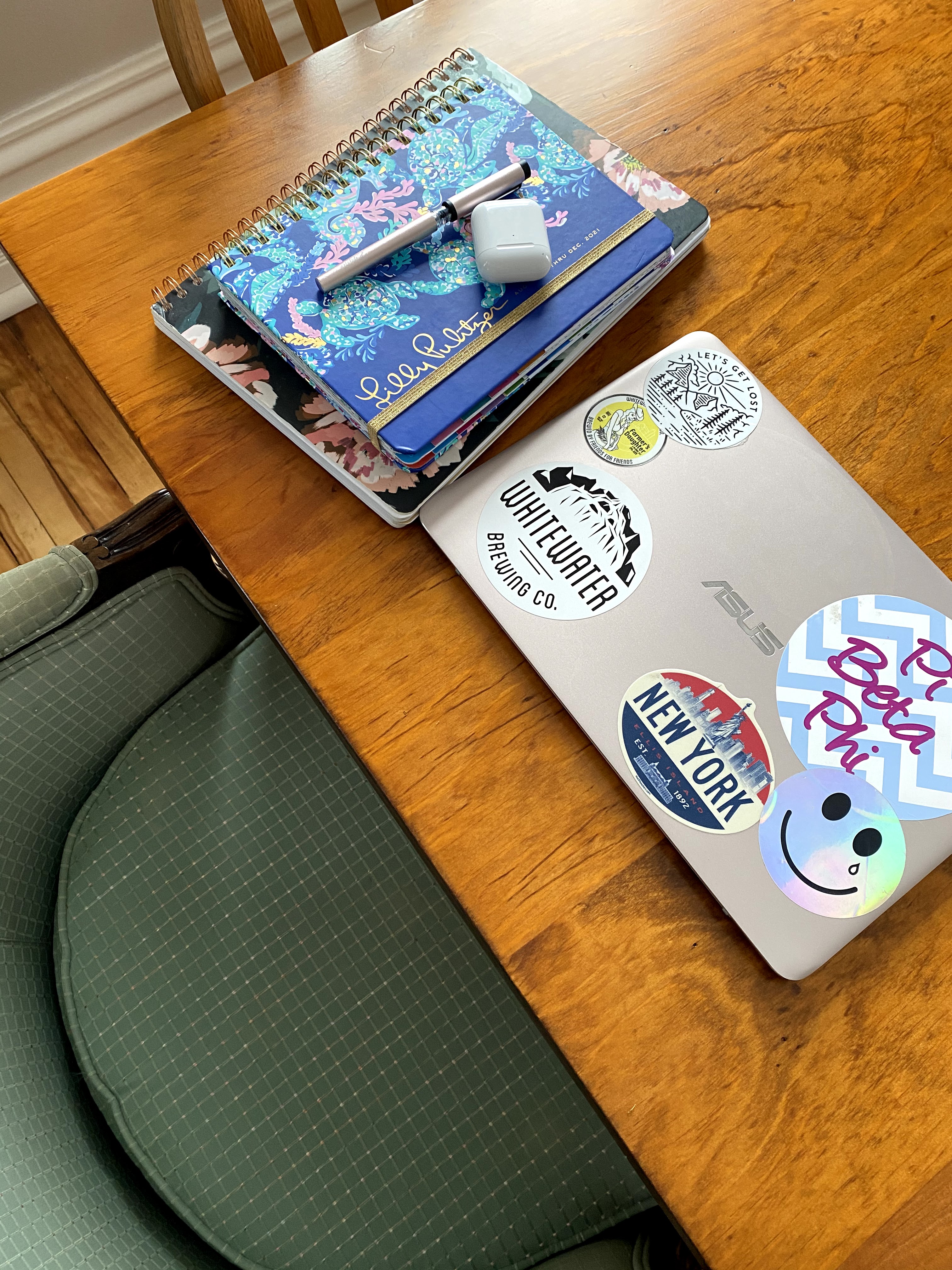 My job hunt kit: laptop, headphones, pen, agenda, and notebook.