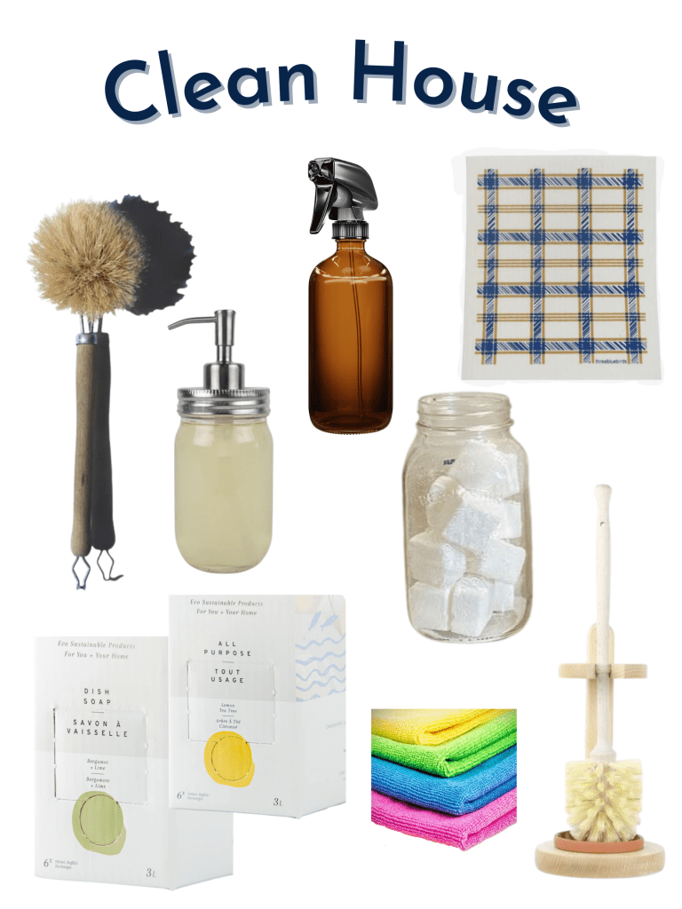 My personal sources for these items are : Long-handled dish brush, amber glass spray bottle (although you can get them everywhere now, I have had mine for 4 years now), Swedish Dishcloth (although we can also get these everywhere now), dish soap pump bottle, toilet cleaning tabs (also I still laugh at myself when I see the jar, mid-July last year when places started doing take-out cocktails I order jars of margaritas from this steakhouse in Oakville and they are the best jars for refilling because they are so big), The Bare Home dish soap (although I have also gotten it from Kind Matter Co. ), The Bare Home all-purpose cleaner (and also at the Kind Matter Co.), and then I just have generic microfibre cloths from Canadian Tire or Wal-Mart or something, my toilet brush and stand are from the Pale Blue Dot, but I think I got my most recent replacement from the Kind Matter Co. (I can’t currently find it on their website). The stand doesn’t seem to be available at the Pale Blue Dot anymore, or at least not online, I did find it at Package Free Co.