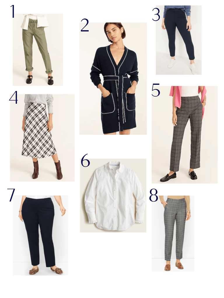 - J. Crew Green Pants 2. ADORABLE J. Crew Sweater Dress 3. Old Navy Pixie Pants 4. J. Crew Skirt 5. J. Crew Plaid Pants 6. J. Crew Ruffle Trim Shirt 7. Talbots Ponte Pant 8. Talbots Glen Plaid Pants