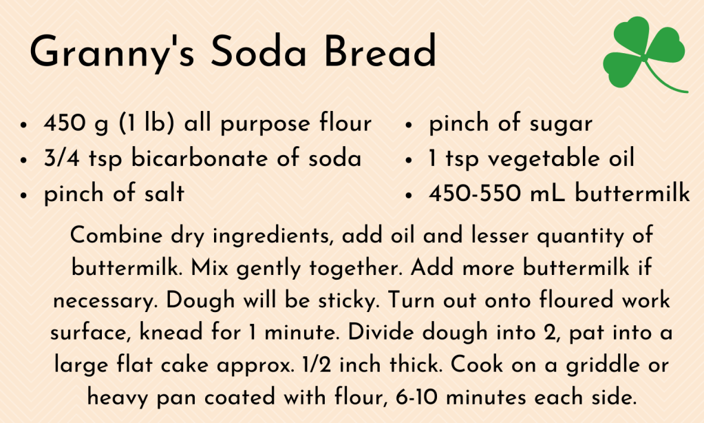 If you would like to try and make your own soda bread, I’m going to put the recipe here. I’m not certain that everyone will like it. We call it stodgy, but I’m not even sure that’s a word that I’ve heard beyond Irish people so, I don’t know if that makes sense. But I’m not certain it’s to everyone’s taste, but it tastes like home to me.