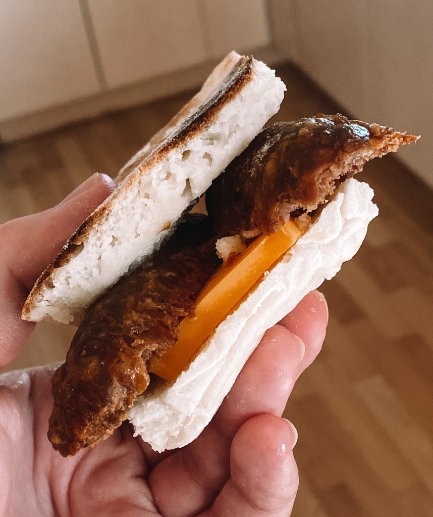 I like to eat my soda plain with butter, however my family likes it better fried or toasted (don’t toast it if it’s fresh, but you can fry it fresh). The best way to eat it though is the Belfast Butty or sausage soda. The sausage soda is super simple, just soda bread and a sausage sliced in half. The Belfast Butty is kind of the same thing but with egg and cheese as well. The picture below is kind of a combo of the two, I didn’t want to fry an egg that night.