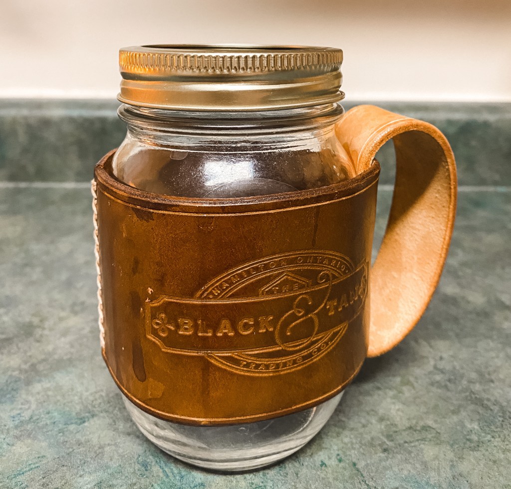 I found this in a kitchen shop in Guelph that is now closed, but it is essentially a leather loop that you put a mason jar in and then it has another leather loop that forms a handle. This is one of the best things I have ever bought. If I get lazy and don’t want to wash dishes, I can just grab another mason jar and pop it in and boom new reusable mug. It’s the best.
