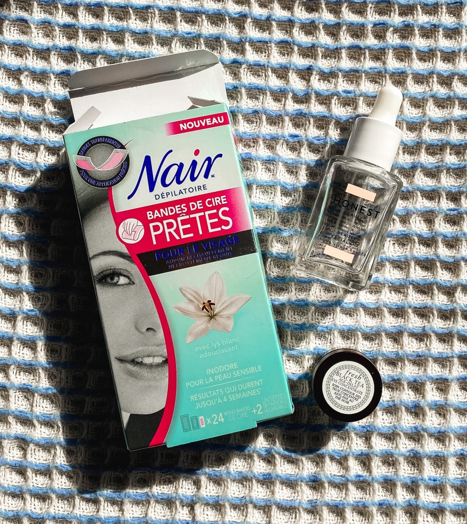 Nair Face Wax Strips: Lol I just noticed that I put these French side up (welcome to Canada! all of our packaged products have both French and English on the packaging). I bought these at the recommendation of a friend, I haven’t been able to find a waxing place up here, the closest one seems to be Fort Frances (about 3 hours). These are alright, I’m not certain if it’s user error or the product, but they don’t grab the soft peach fuzzy mustache hairs very well. They will get the thick hairs, but especially on the upper lip the wax just sticks to my skin and I basically have to scrape it off afterwards. Not fun, but I did re-buy. I just remembered a couple days ago that they generally put a powder (maybe baby powder?) on the upper lip and I wonder if that helps with the wax sticking to your skin? I want to try it, but I also don’t want to buy a big thing of baby powder so I’ve been wondering about flour? Too far?