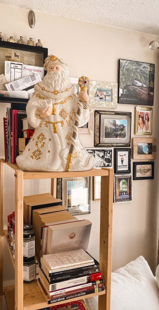 This is my favourite Santa my mom ever had. I remember when she got it in Tennessee, I believe it was from this store in Paris called Najie’s, it was our favourite gift shop when we lived there. He’s actually a cookie jar, and although he doesn’t suit this bookcase, I always like to make sure that he is in pride of place.