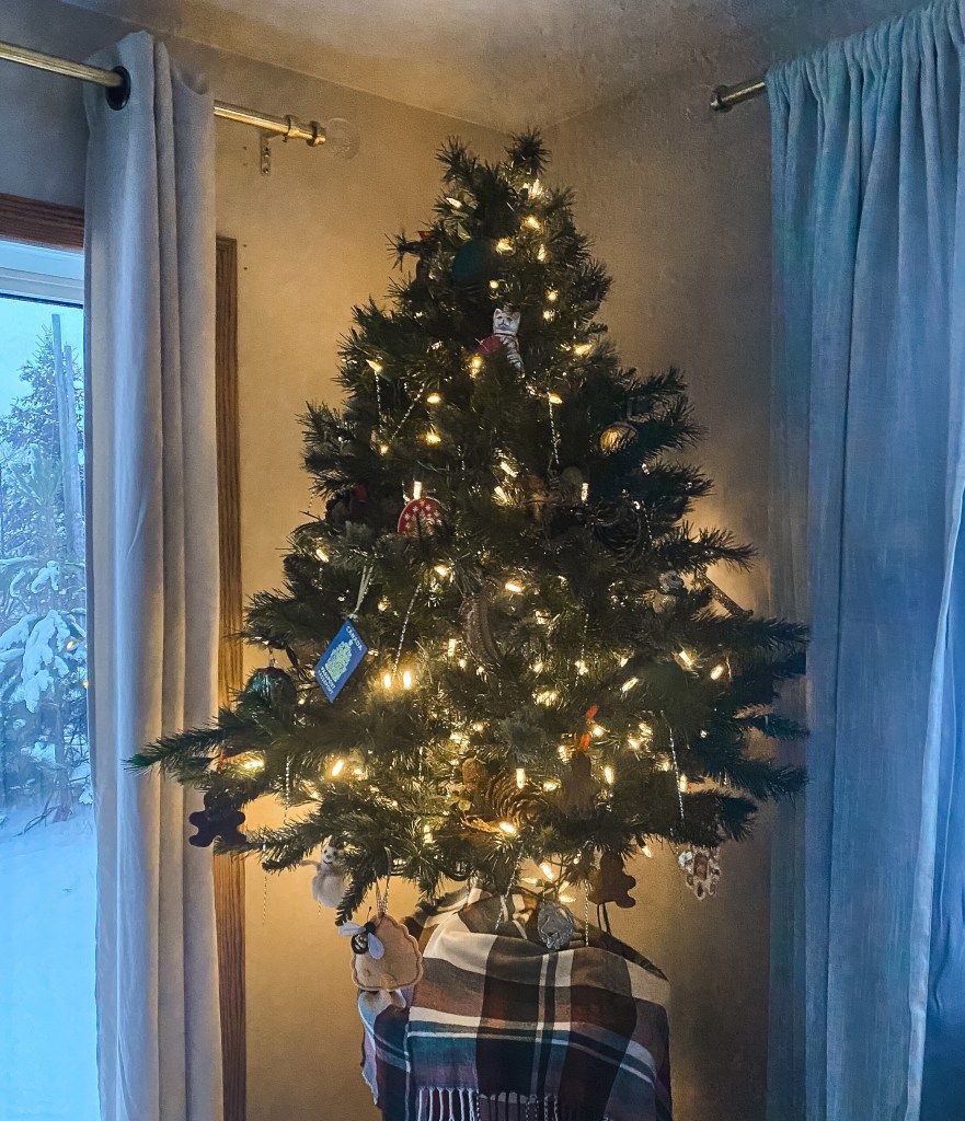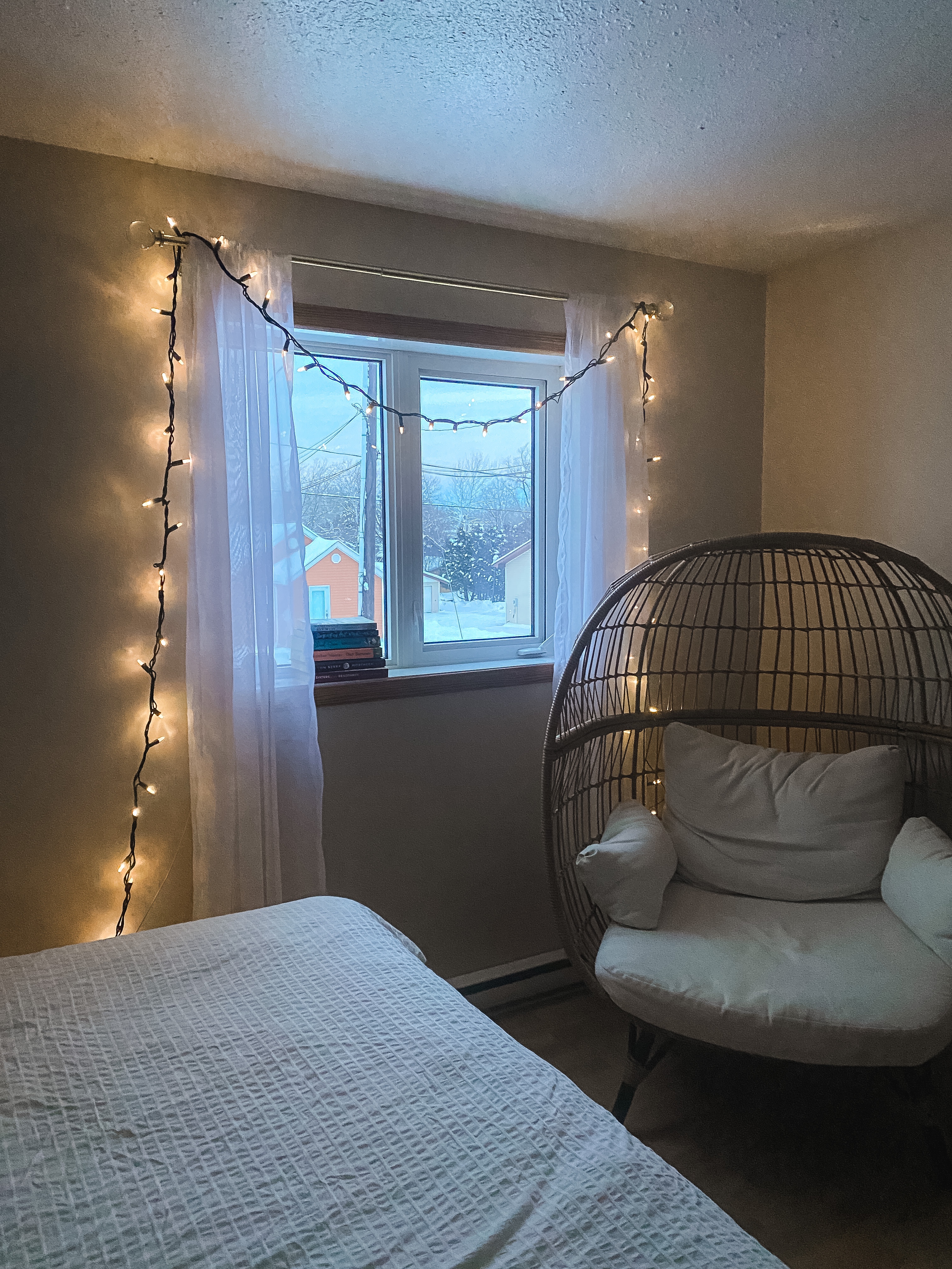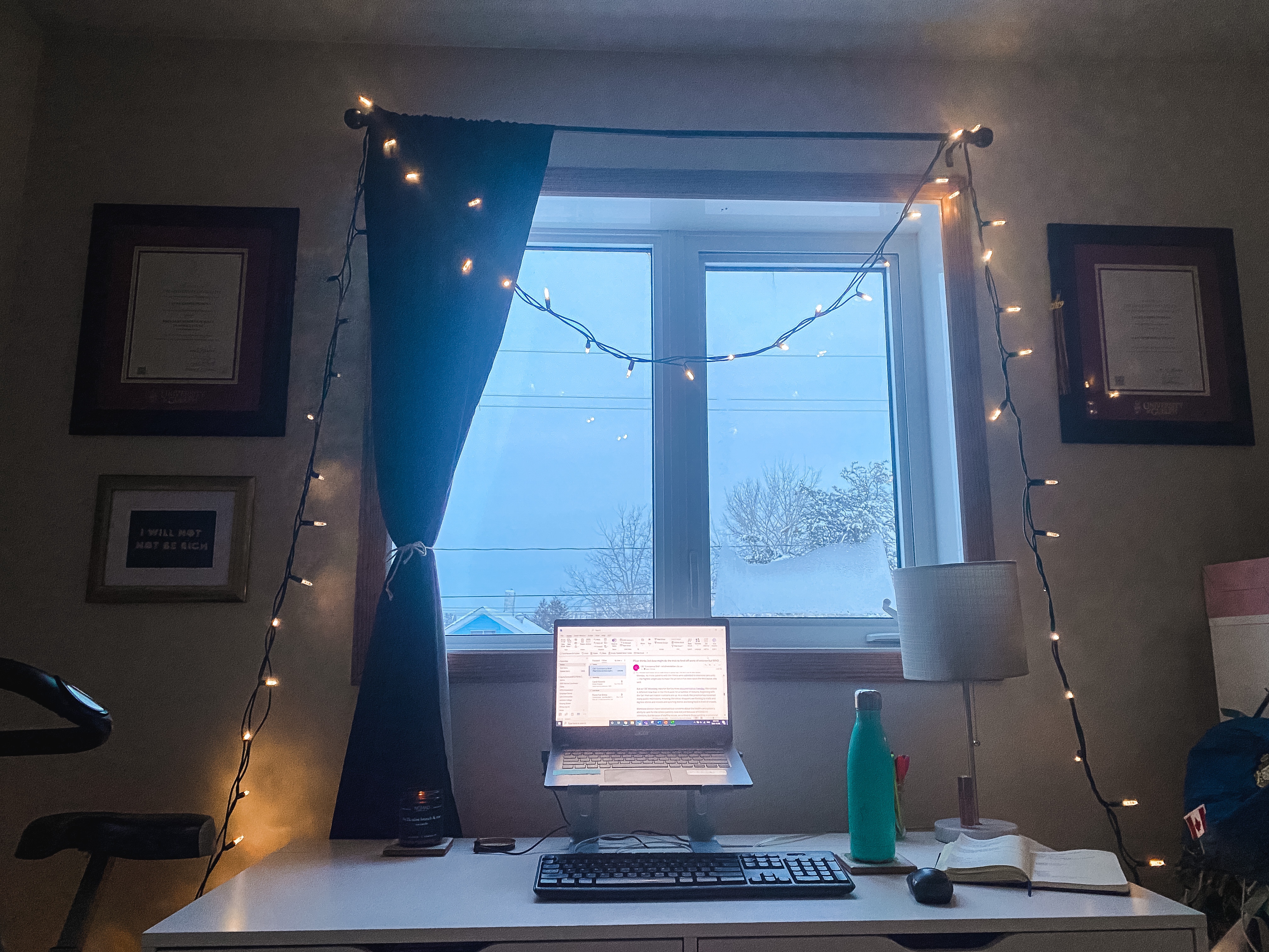 I always have a couple extra strings of lights after I decorate my tree. And I have three strings of lights that are the same shade of light and then two that are a slightly different shade of light. So I’ve taken to draping those over windows for three Christmases now. It makes my bedroom and work-from-home cave feel so cozy. I also love my needlepoint wall with the extra lights from over my desk. I kind of want to leave these up year-round. But I don’t like the thick green cord, so I might look into other options.