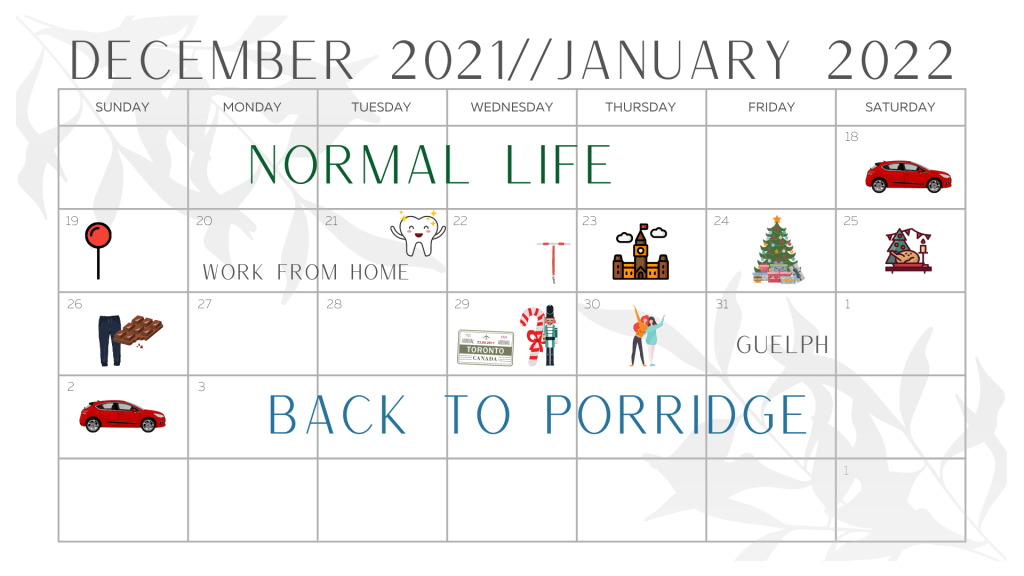 I am so excited to be heading home and to bop around Southern Ontario for 17 days (well four of those will be driving to and from Southern Ontario). I am a bit worried that Ms. Omicron will ruin this for me, but I am keeping my vaccinated fingers and toes crossed in hope. I made all of these plans before she became such a thing, but I am getting my booster dose tomorrow morning and am getting tested at a pharmacy tomorrow afternoon before we start driving. I also plan on getting tested when I get home and then again after Christmas before I head down south. So while I don’t think keeping all these plans is the most responsible I can, these plans are the only thing giving me hope at the moment and yes I realize how sad that sounds but I know I am not the only person who has had long year this year.