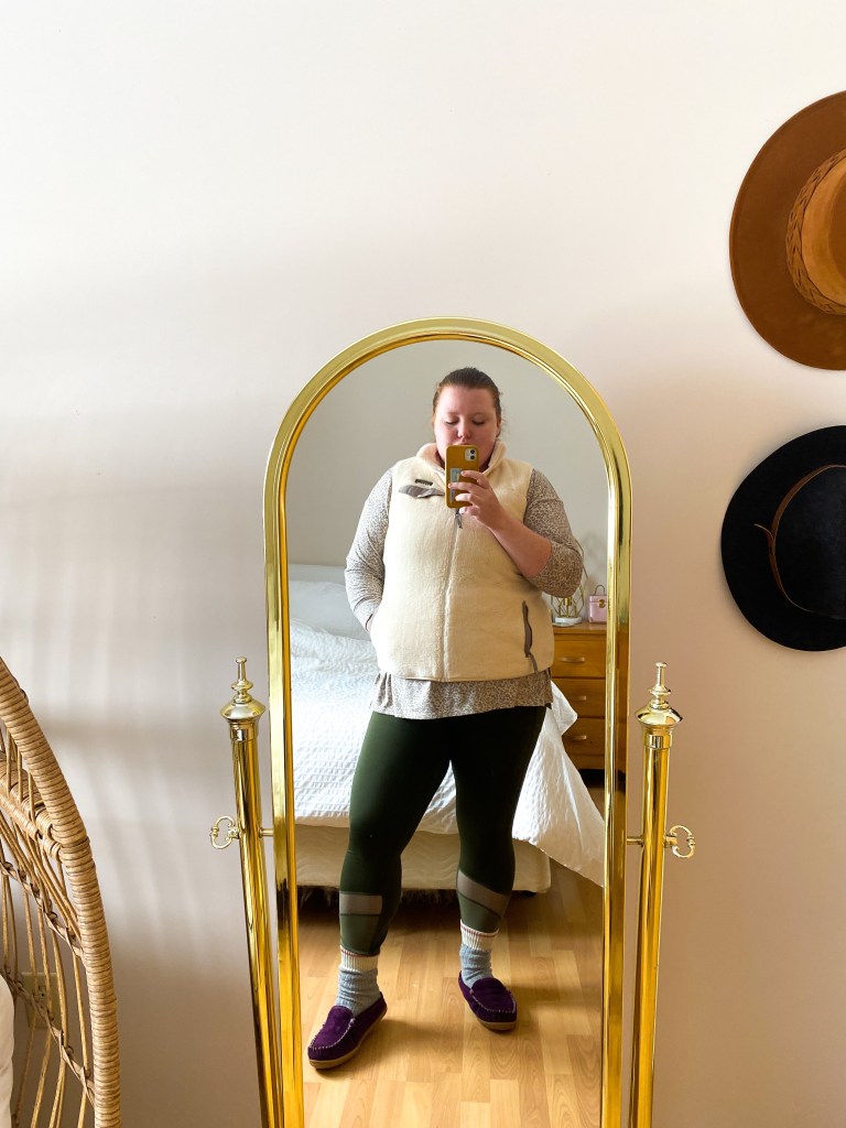 Monday // L.L. Bean Vest (similar), Aerie Henley – Old, Joe Fresh Leggings – Old, Roots Socks, L.L. Bean Slippers