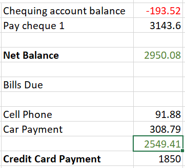 Calculating my credit card payment. So once I have subtracted my bills from my “working balance” I then, hopefully have a decent amount of money left. From there I figure out how much money I need to live on for the next two weeks, groceries, cleaning and hygiene supplies, pet food, maybe a bit of fun etc. And the rest becomes my credit card payment for that pay cheque. That’s a lot of words to describe what essentially looks like this: