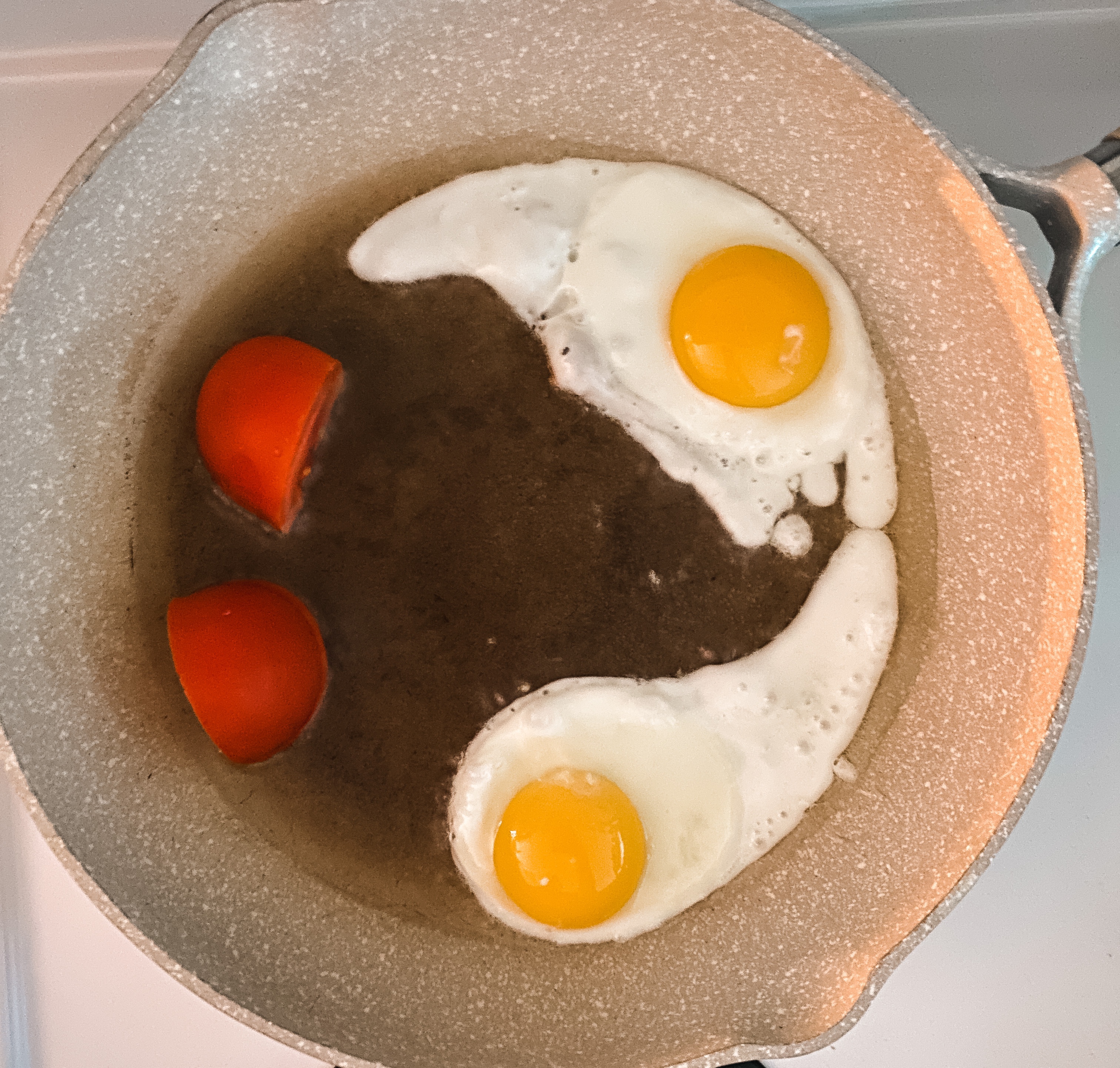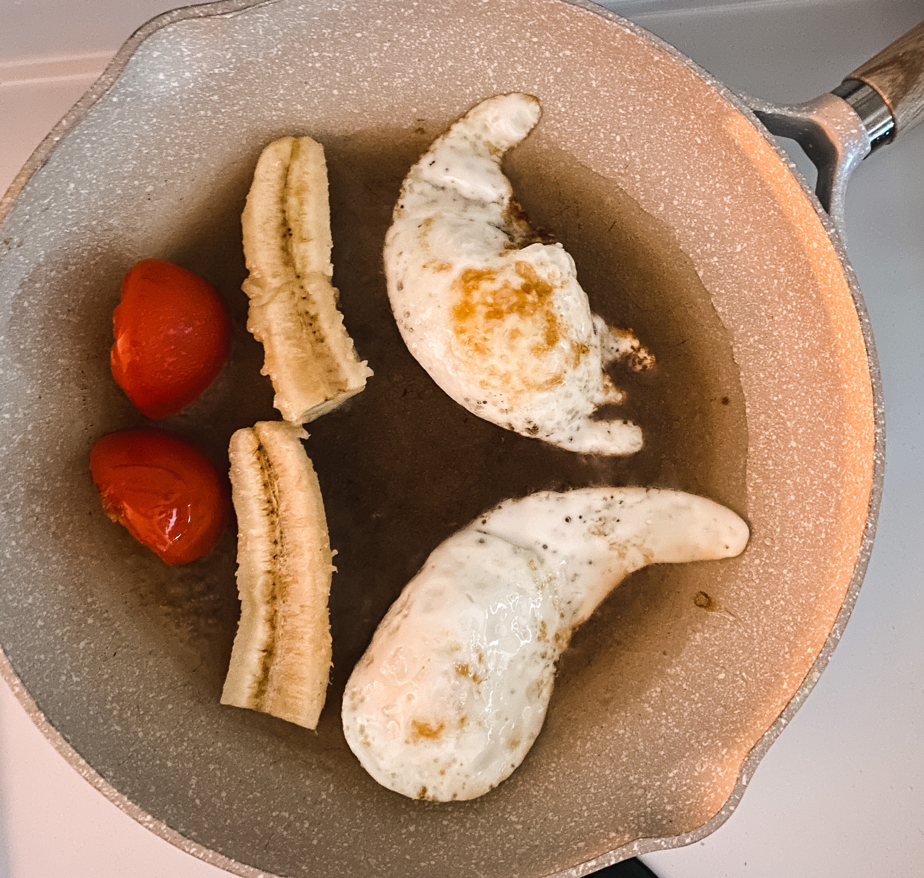 So then the rest of the fry. I base mine of what my mum included in hers, although I don’t love all the components. Basically, we have fried eggs, bacon or sausage (sometimes if it’s all of us we’ll do both, but when I’ making it for myself I don’t do that), and then fried tomato and fried banana. I don’t typically do the fried banana, I have a texture thing with some foods and the fried banana can set it off. But I wanted to try it again as an adult and see what I thought.