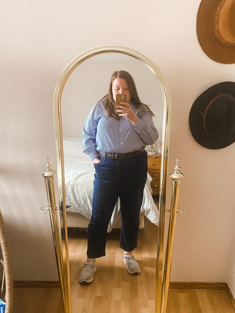 What I wore: Blue and White Stripe Blouse – Reitmans, Jeans – Reitmans, Sneakers – Vessi