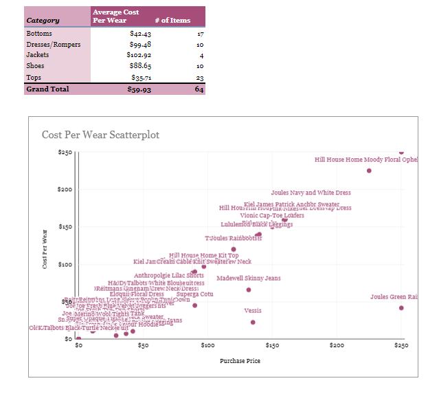 My chart is still a little skewed, you start from 0 wears, but you put the purchase prices of all the items you know or can look up the purchase price of. So I haven’t worn my winter coat in the two weeks since I started tracking, so it looks like it hasn’t been worn at all, but I wore it all the time for 4 months, so it’s cost per wear should be in the single digits, but because I haven’t worn it in the past 2 weeks, it’s cost per wear on the chart is still it’s purchase price. So it’s kind of frustrating that things that I’ve had for ages and know in reality have a low cost per wear, don’t have that reflected in the data. I’m going to estimate that it will take about a year to get a truly accurate picture of your wardrobe’s true state. But it is fascinating.