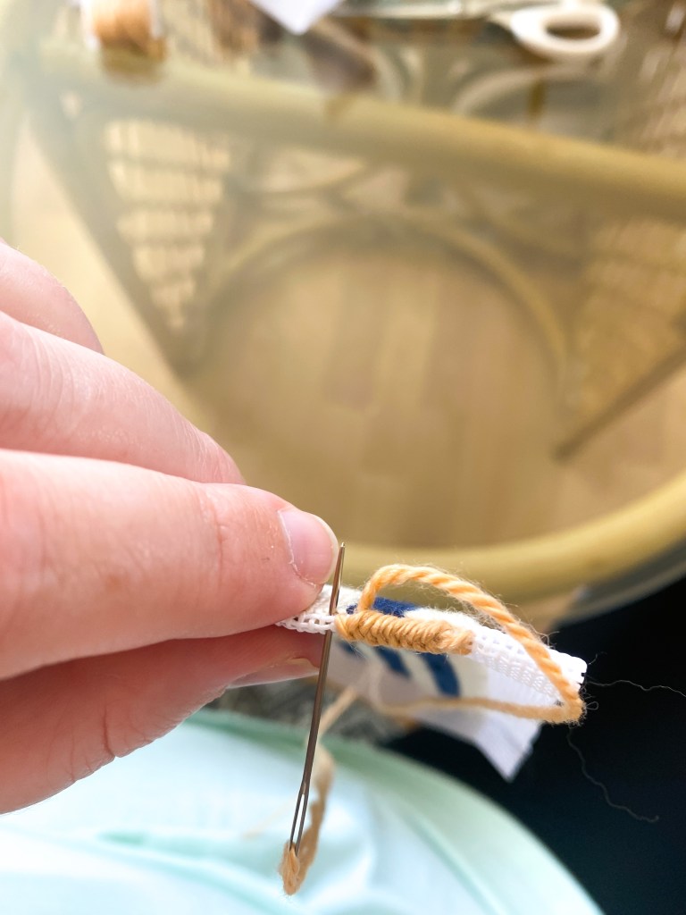 I was so torn for colour of the binding stitch, I ended up going with one of the hat threads. I was initially leaning towards this red wool I had in my kit as a leftover, but it was too thick to pull through the canvas, so I kept with this Silk and Ivory thread.