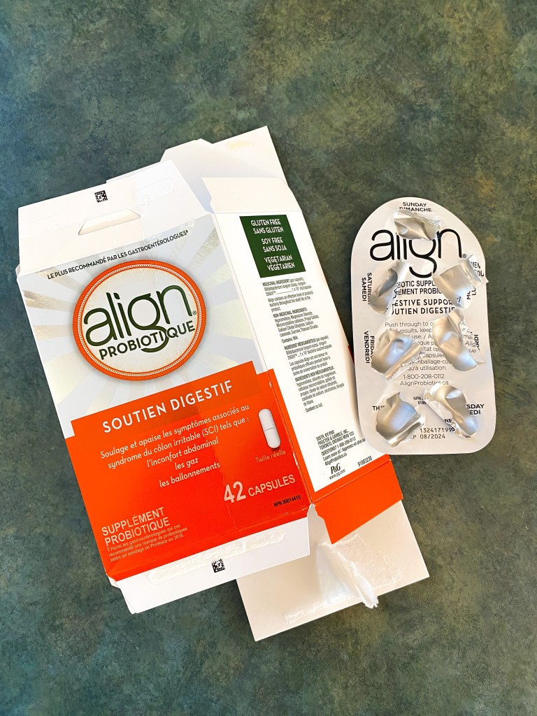 This is my second empty box of Align Probiotic and I am now about a month out from finishing this box. I don’t know if I’m going to buy another box, the first two weeks after I stopped taking them was a bit rough, but after that it wasn’t any different than while taking them. So I’m not sure, I’m not a total skeptic of probiotics, but I don’t know if it’s worth the money.