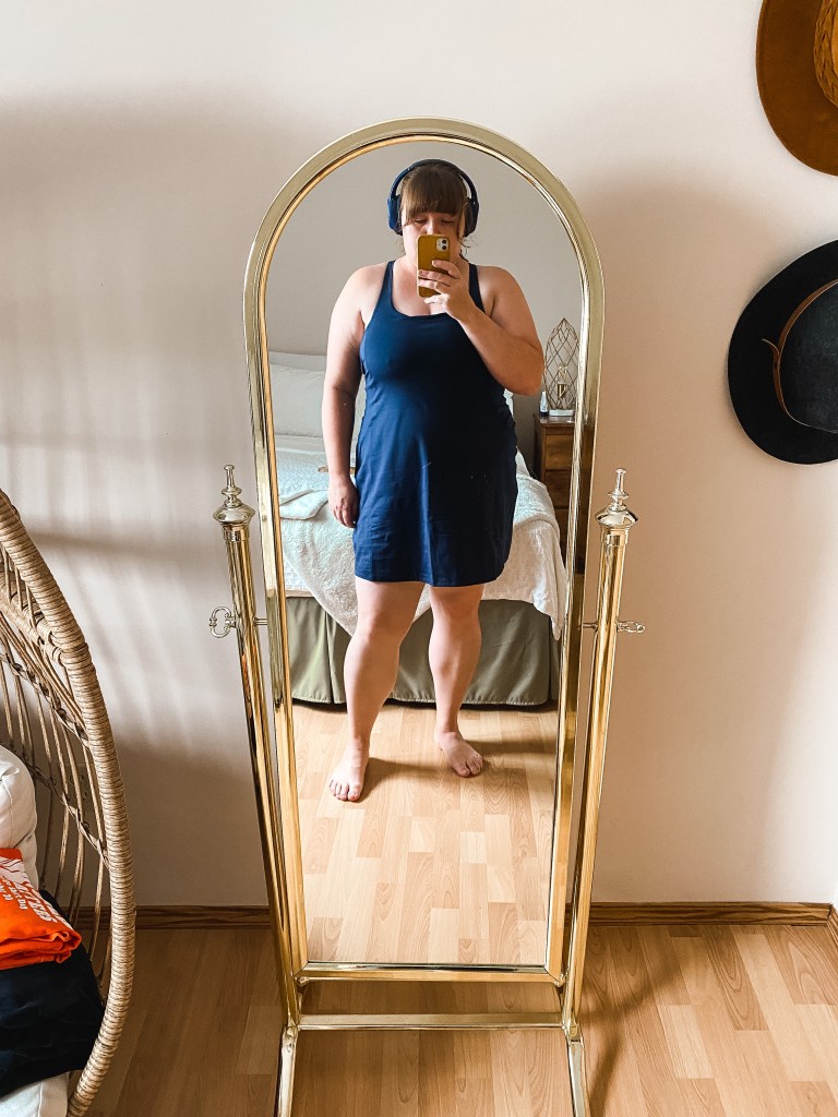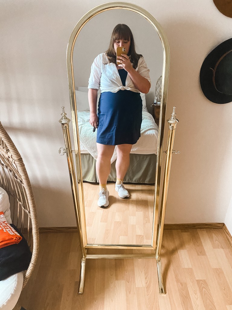 What I wore: White button-down – old – Old Navy, Exercise Dress – Girlfriend Collective, Shoes – Vessi, Skates (not pictured) – Boathouse.