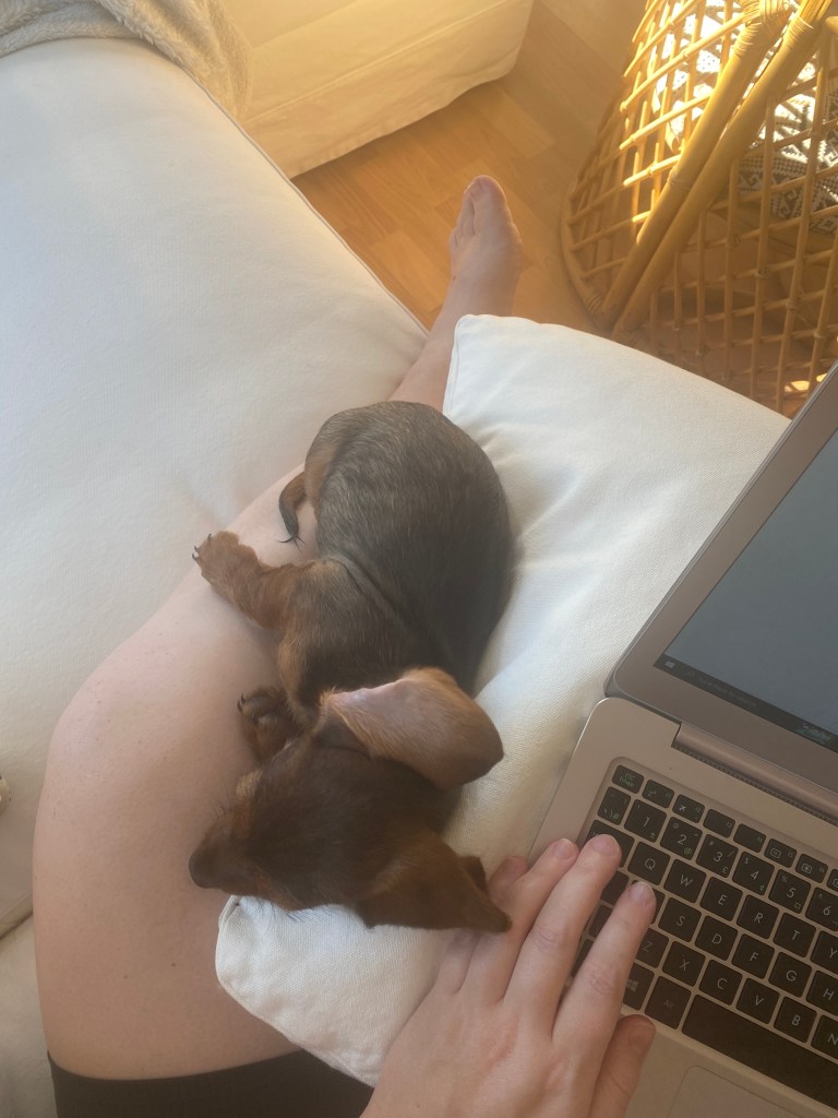 I pet sat my landlord/one of my bosses’ new puppy, it had been in the vet clinic suspected of marijuana toxicosis and they were very worried about leaving him with their 15-year old for the weekend, so I offered to take care of him and at one point this is how we spent a few hours.