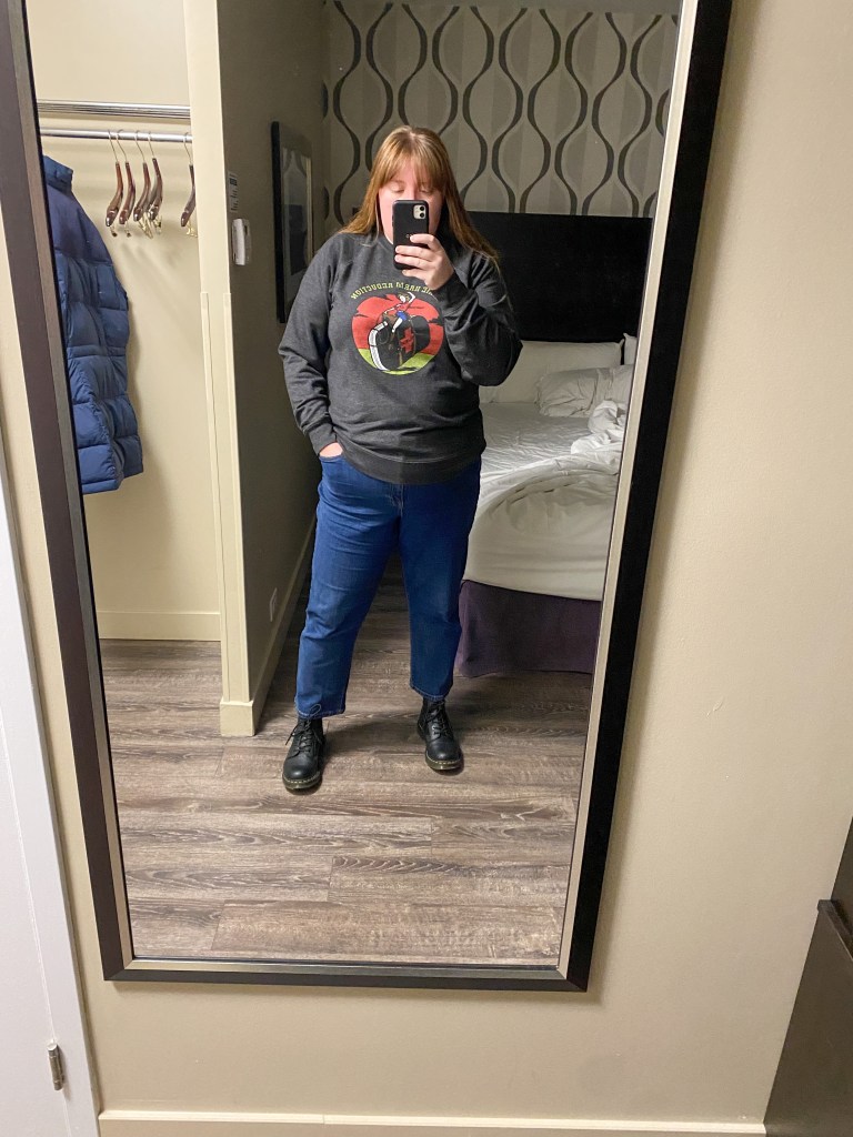 What I wore: Sweatshirt – Prairie Harm Reduction, Jeans – Reitman’s, Boots – Doc Marten, Parka (in background) – L.L. Bean