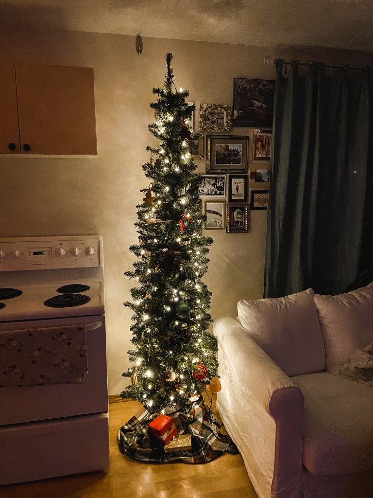 My Christmas tree. I don’t know if I love the look of a pencil tree, however it just works so much better in my apartment than a cone shaped one. Also, holy heck I had no clue that pre-lit trees were that much easier. It used to take me hours, like 4-5 hours to put the lights on the tree. And the foot button to turn the lights on and off! Best invention ever.
