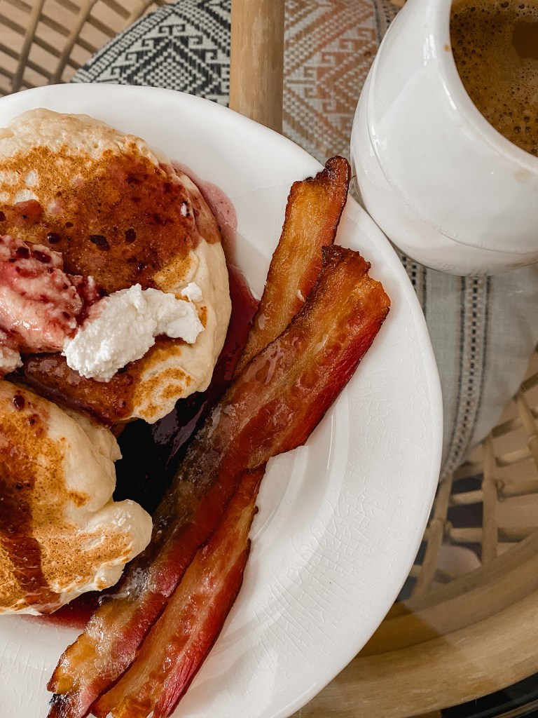 This was another HelloFresh recipe, one of their breakfast add-ons. Lemon ricotta pancakes with blueberry syrup and bacon. I was hoping it would be similar to the ricotta pancakes at Kerr Street Cafe, and it was similar, but couldn’t meet that high bar. Still yummy, just not Kerr Street Cafe yummy.