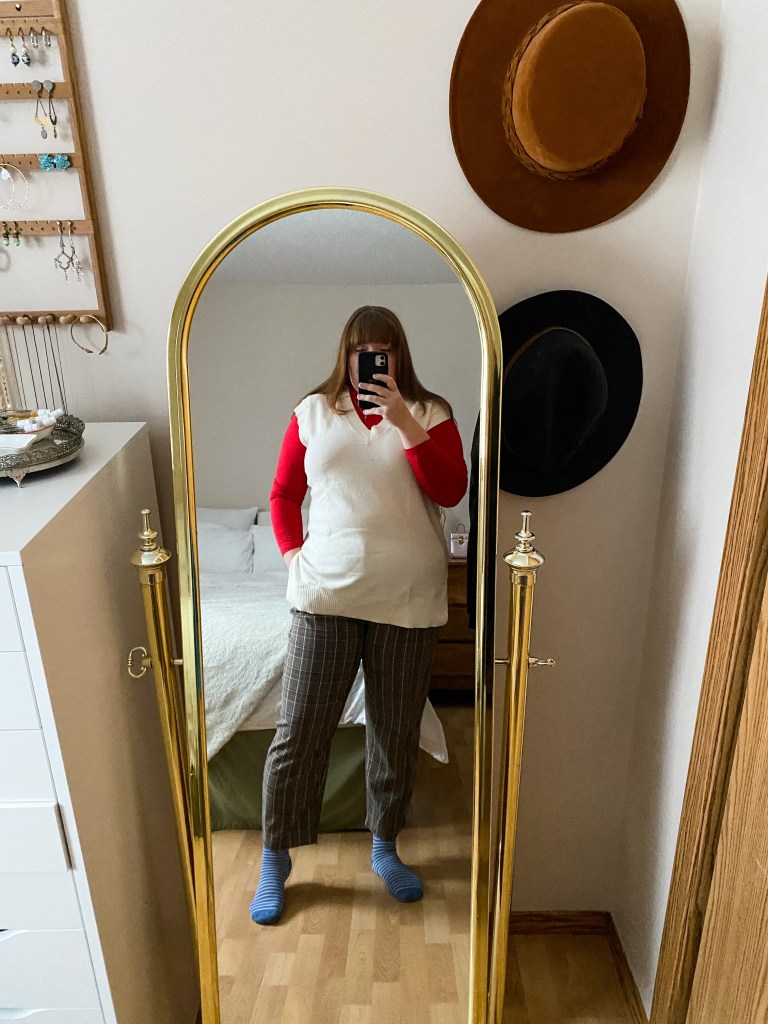 What I wore: Sweater vest – old – Joe Fresh, Bodysuit – Amazon, Pants – old – Joe Fresh