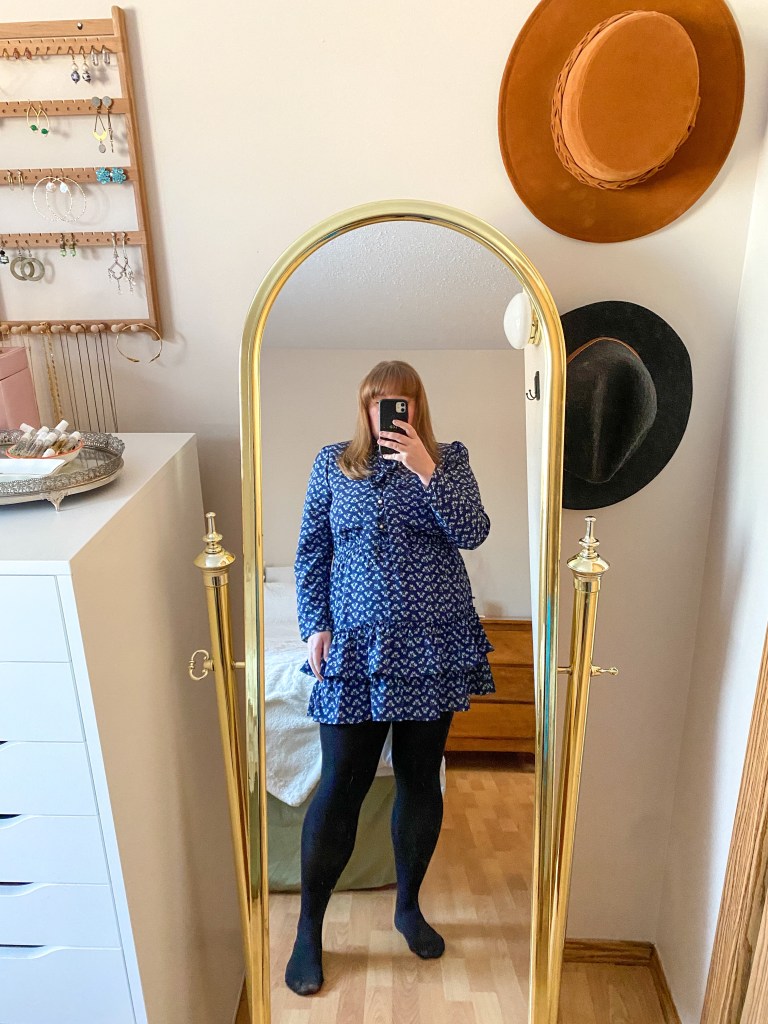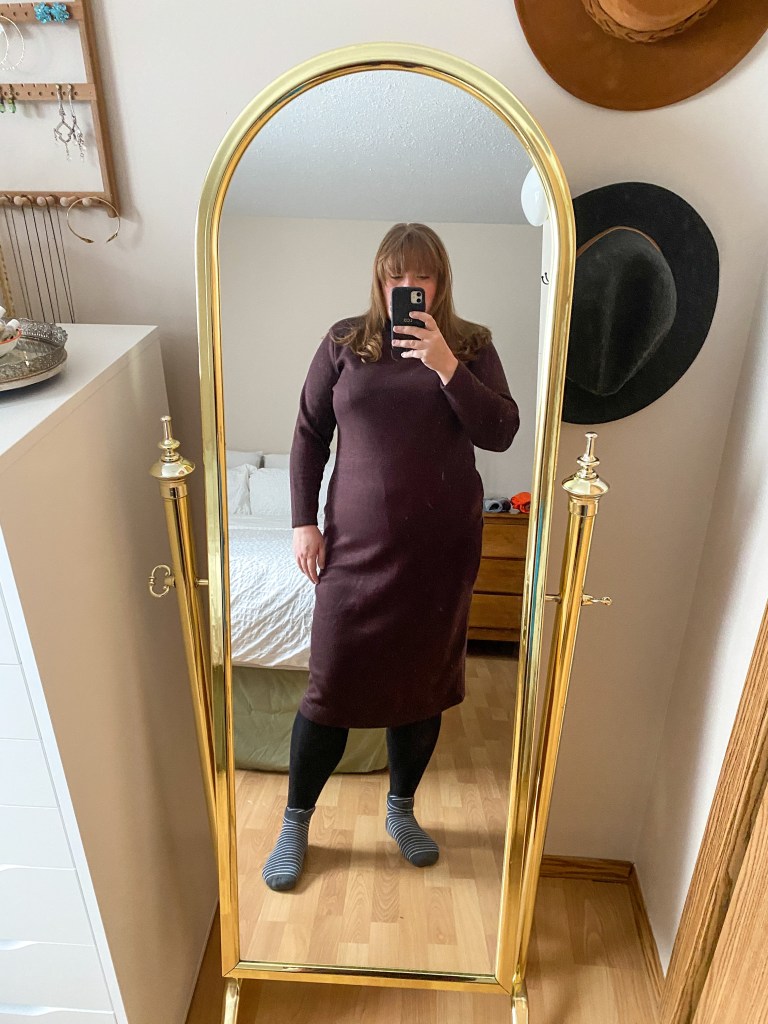 What I wore: Dress – Hill House Home, Tights – Snag. Side note – I bought this dress in the fall and this is the first time I wore it because it gapes at the bust. However, TikTok reminded me about wearing really compressive sports bras with these kinds of tops and dresses and it makes it fit perfectly. The actual TikTok was about wearing a binder (what people born as women with gender dysphoria or who are non-binary or transitioning wear to reduce the appearance of the breasts), but in the comments people were talking about different sports bras they use and I was inspired.