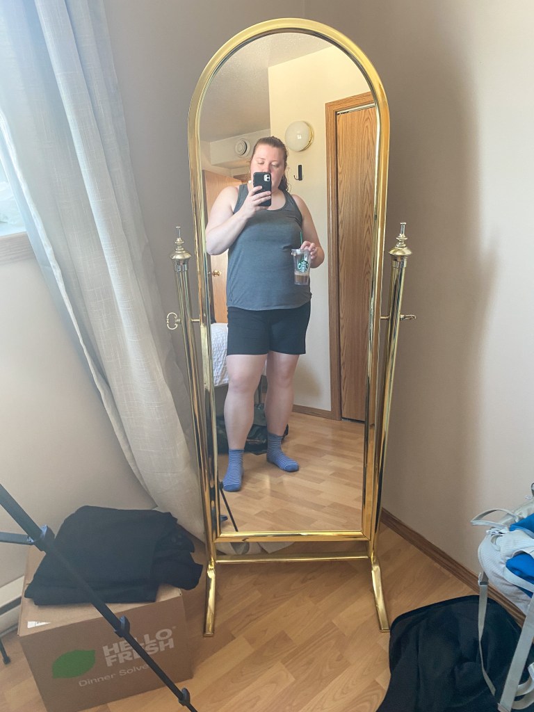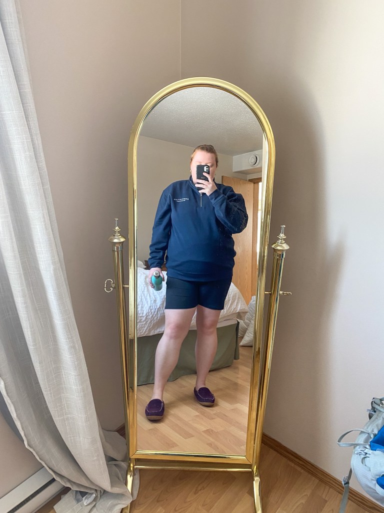 What I wore: Quarter-zip: Grad school merch, Shorts – Girlfriend Collective (Girlfriend is pretty notorious for running small, but in my opinion take your normal size in these, I sized up and they are too loose, great for lounging but I don’t workout in them because they move around too much). Slippers – L.L. Bean (currently on sale!)