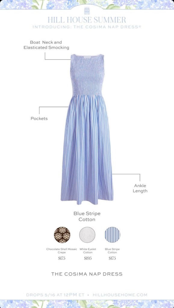 If you are not familiar, the Nap Dress is a trademarked dress style made popular by Nellie Diamond’s company Hill House Home. They initially started as a bedding company and still do make bedding (I’m currently lusting after this Green Vine Stripe Bedding Set) and their first dresses were dresses that were so comfortable that they could be slept in, but cute enough, and enough not like pyjamas that they could be worn out of the house. Nell often describes her aesthetic as “Victorian ghost” and these dresses were very much that. This where the classic Nap Dress silhouette, the Ellie, came from, but there were also styles. As the fashion side of the brand started to explode they have, logically IMO, capitalize on that and their fashion section has very much popped off, leading us to where we are today.