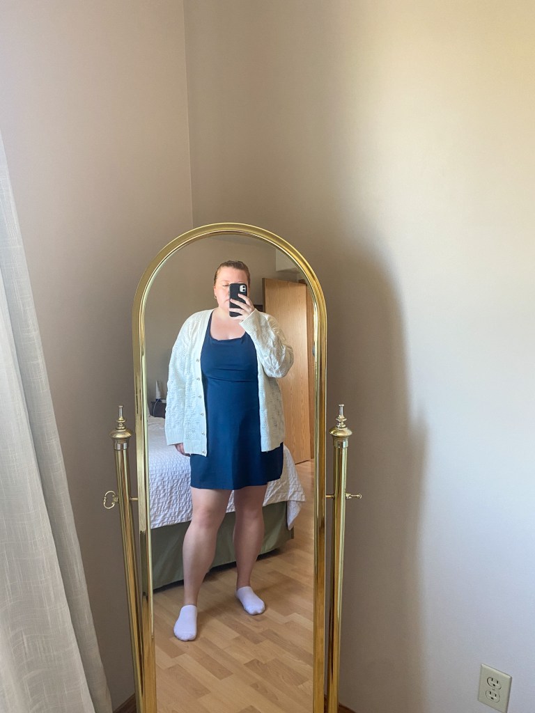 What I wore: Cardigan – Old – Hill House Home, Dress – Girlfriend Collective
