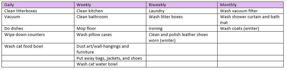 This is what has to be done to maintain my apartment to the standard I like, and how many clothes I have before I have to do laundry.