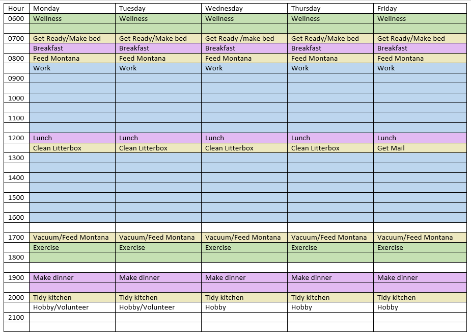 In particular, what I really want to make sure is that I don’t leave chores for the next day. No more dirty dishes left overnight, not leaving stuff all over the tables to deal with the next day, packing my work bags, not leaving my ironing all week. Being tempted to go to Tim Horton’s, Subway, or a coffee shop because I didn’t meal prep for breakfast or lunch.