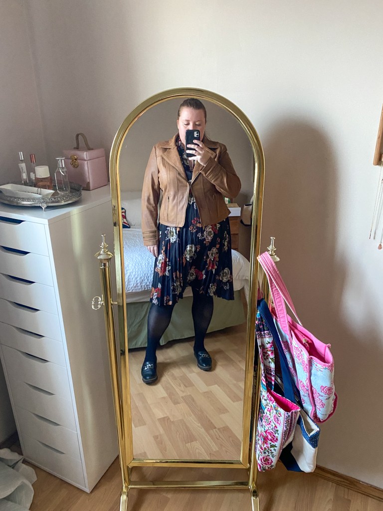 What I wore: Dress – Old – Reitmans, Tights – Walmart, Loafers – Old – Vionic.