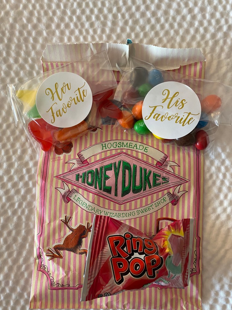 For my friend’s wedding they put together these little gift bags, with his favorite candy and her favorite candies and a ring pop. I ditched the ring pop but it was so cute. They bonded over Harry Potter and he proposed at Harry Potter World hence the Honeyduke’s bag.
