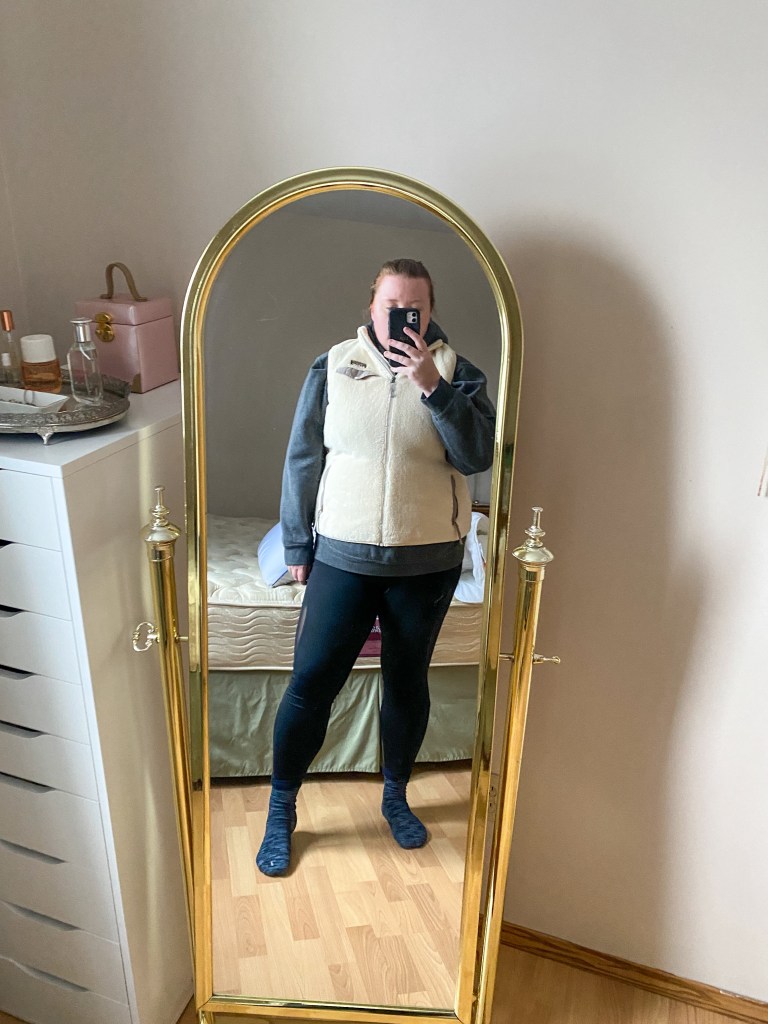 What I wore: Vest – Old – L.L. Bean, Hoodie – Old – Grad School Merch, Leggings – Old – Aerie.